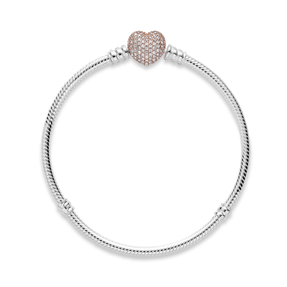 Ponle algo de amor a tu estilo con el brazalete de cadena de serpiente de Pandora Moments, al que se le dio una actualización romántica con este broche en forma de corazón en Pandora Rose, nuestra mezcla única de metales enchapada en oro rosa de 14k. El bonito corazón está detallado con circonia cúbica que le brinda un acabado reluciente. El estilo en plata esterlina pasa sin problema del día a la noche, y creemos que luce igualmente elegante si se usa con o sin charms, sola o apilada. Úsala para mostrar una o más de las cosas que amas.